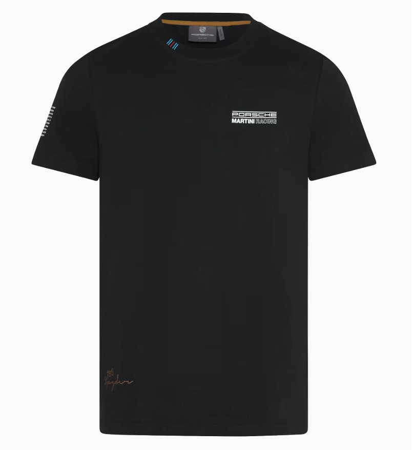 Apresentamos a camiseta masculina preta da coleção Martini Racing da Porsche, perfeita para fãs de automobilismo que buscam estilo e conforto. Com corte regular e confeccionada em 100% algodão, essa camiseta oferece toque macio e resistência para o dia a dia. Possui gola redonda com bordado Martini Racing e riscas icônicas estampadas nas costas, inspiradas no lendário Porsche 936 Spyder, além de logos Porsche e Martini Racing no peito e bordados exclusivos na bainha. Ideal para quem valoriza autenticidade e a paixão por corridas, combinando com diversas ocasiões casuais.