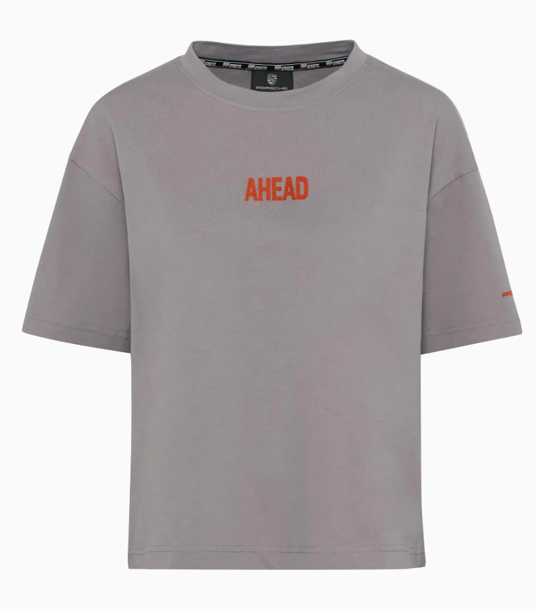 Road trip encontra estilo de vida: a coleção AHEAD combina espírito pioneiro e sede de aventura com design icônico. A camiseta feminina tem corte oversized e boxy, gola mais larga e ombros caídos. Print flock AHEAD na frente e estampa grande nas costas.