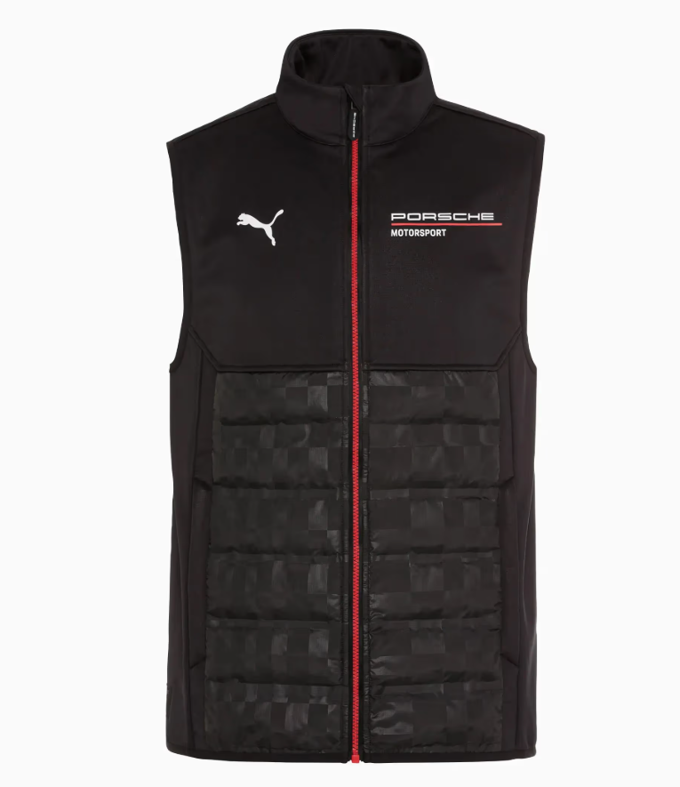 O colete unissex Porsche Motorsport combina proteção e estilo automotivo em um design moderno. Com corte regular e gola alta, oferece conforto e proteção contra vento para climas amenos. A mistura de softshell e nylon acolchoado, com o padrão “Pascha” dos anos 70, garante resistência e sofisticação. Zíper vermelho marcante e bolsos com puxadores estampados com o logo Porsche trazem funcionalidade e exclusividade na peça.