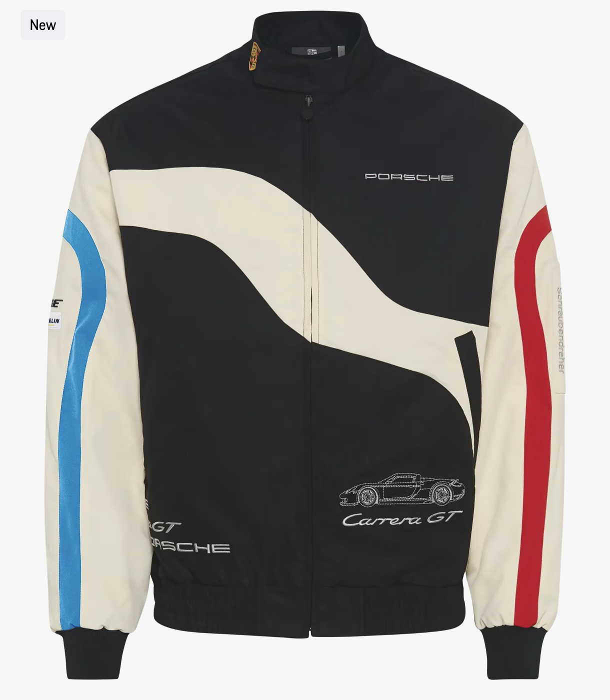 A jaqueta blouson unissex da coleção “25 Y Porsche Carrera GT” nasce da essência do carbono, do som e das curvas — características que definem o Porsche Carrera GT. Essa peça exclusiva marca os 25 anos do modelo lendário e traduz design e performance em uma nova forma.