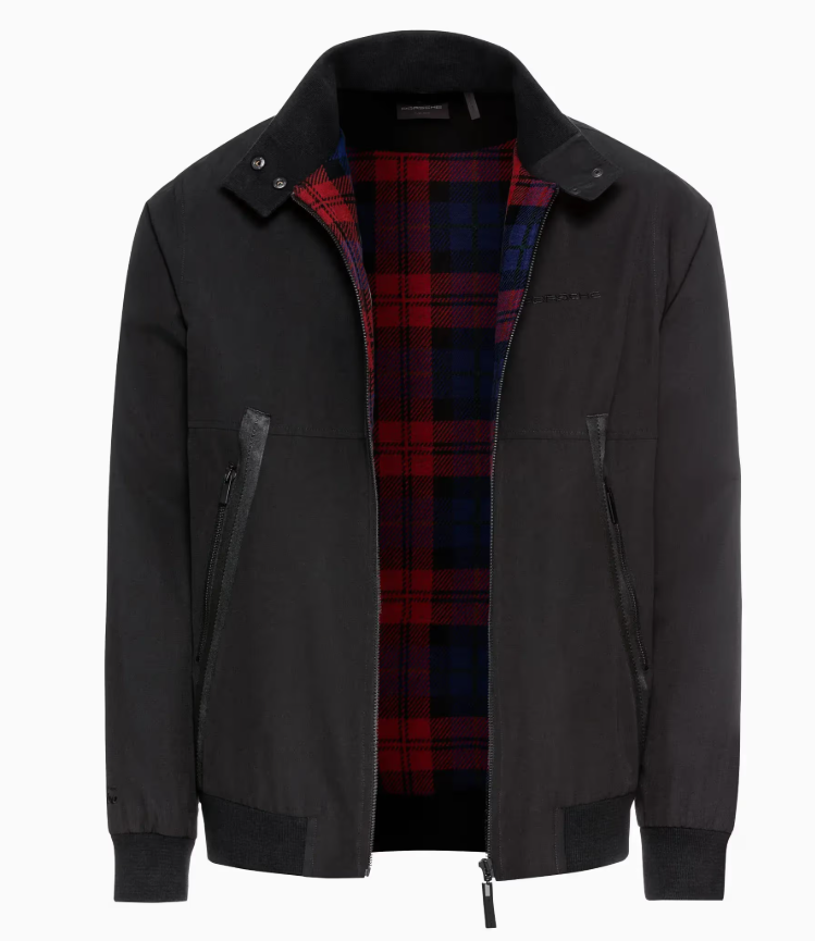 Detalhes em destaque: etiqueta interna com padrão xadrez, impressão 3D “Porsche/Turbo” no antebraço direito, puxadores de zíper com marca.