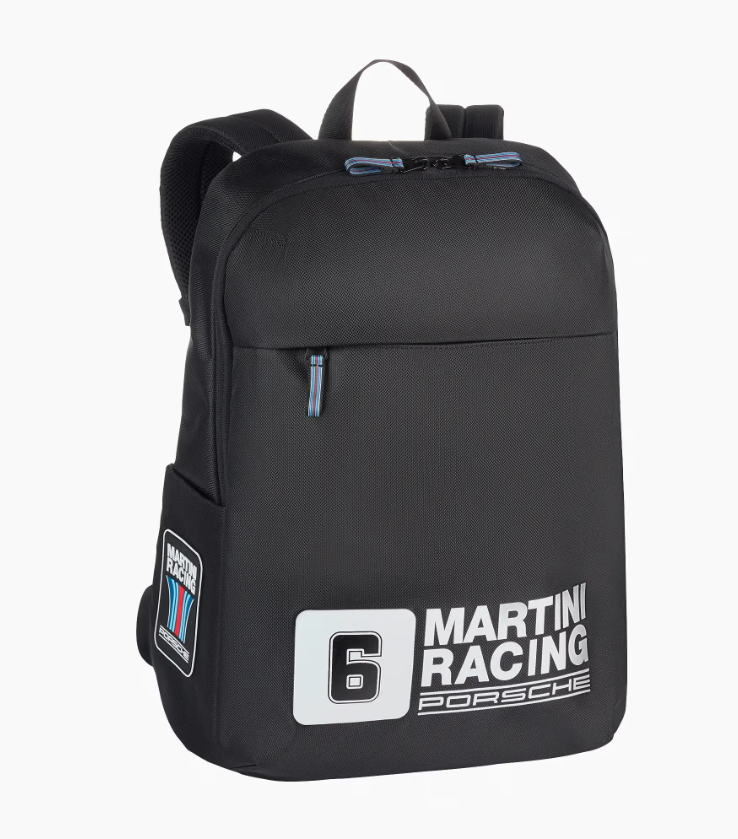 Estilo de corrida no seu melhor. A mochila da coleção MARTINI RACING® da Porsche inspira-se no design desportivo do Porsche 936 Spyder. Sua disposição cuidadosamente pensada oferece espaço de armazenamento ideal para o uso diário e para viagens. O compartimento acolchoado para notebook protege laptops de até 13 polegadas. Bolsos laterais adicionais com possibilidade de expansão, um bolso frontal com zíper e um organizador de negócios integrado mantêm o interior bem organizado. As tiras de ombro acolchoadas e ajustáveis em comprimento, feitas de cintos de segurança robustos, e um painel traseiro reforçado com liga-carrinho garantem máximo conforto de transporte. A base durável protege o conteúdo contra influências externas. Detalhes especiais de design incluem o logotipo Porsche e MARTINI RACING®, além do padrão de riscas característico na frente.