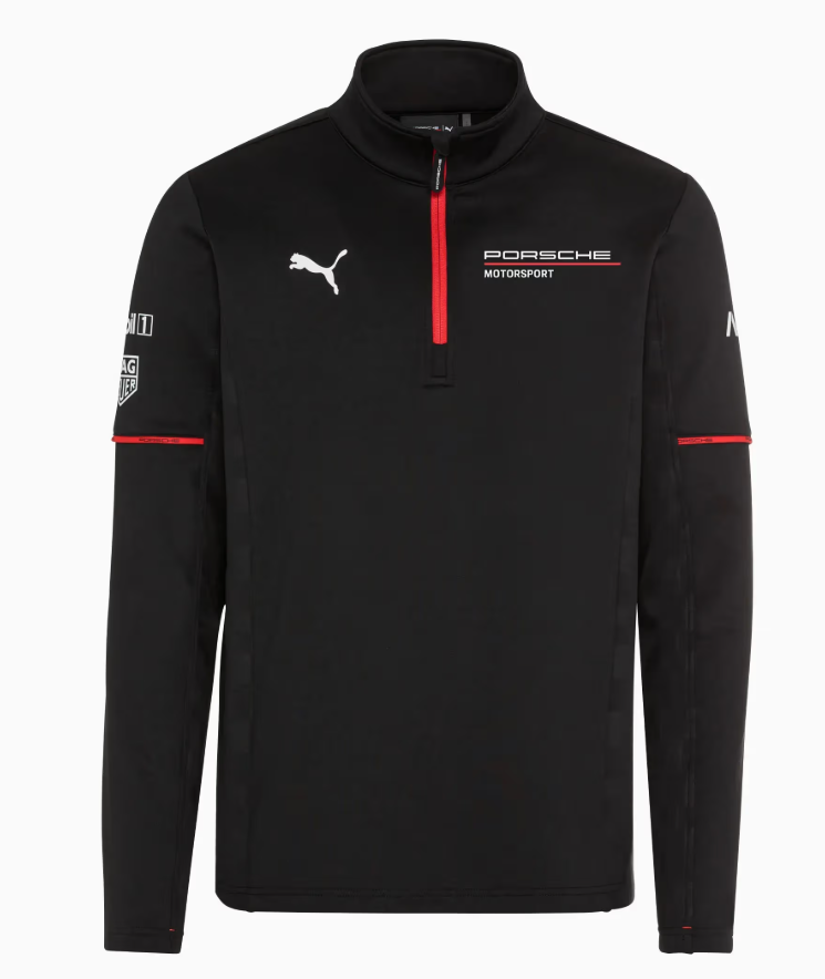 Experimente a pura paixão do automobilismo com a coleção Porsche Motorsport Replica: os acentos marcantes em vermelho e o icónico padrão “Pascha” dos anos 70 unem a rica história da Porsche com a dinâmica das corridas. Com ajuste confortável e material fleece elástico macio, esta peça unissexo destaca‐se pelo conforto. Lados e antebraços com padrão Pascha tom‑sobre‑tom reforçam o visual desportivo. Zíper na gola alta e piping contrastante vermelho nas mangas acrescentam detalhes visuais. Os detalhes de patrocinadores, logótipos e a etiqueta “Raceborn” nas costas completam o carácter motorsport.