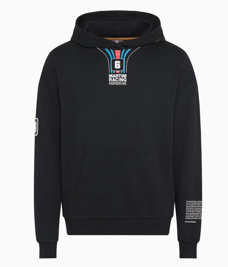 Na compra, você recebe um suéter preto Martini Racing Porsche, com capuz ajustável, confeccionado para oferecer o melhor do design racing aliado à funcionalidade. O produto é exclusivo da coleção inspirada no Porsche 936 Spyder e ideal para fãs de automobilismo e estilo casual premium.